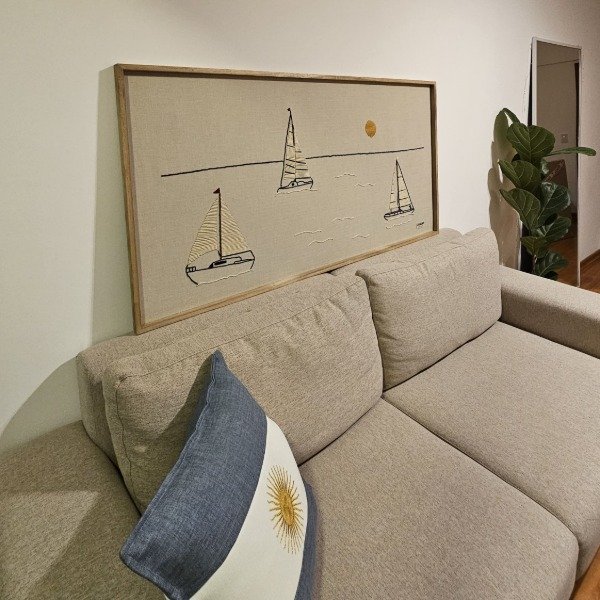 Bordado a mano en negro, rojo, crudo, marrón y amarillo sobre lino crudo.