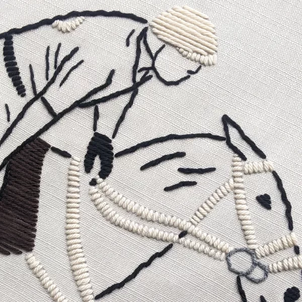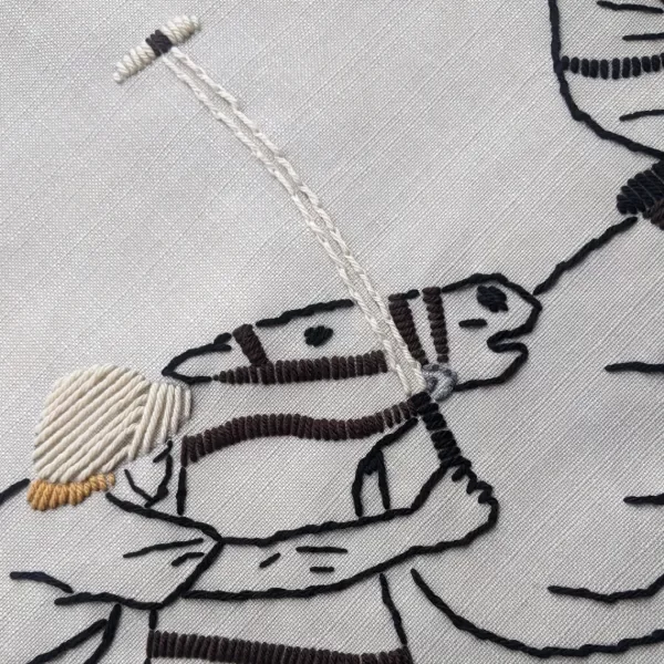 Bordado a mano en negro, marrón, amarillo, gris y crudo.