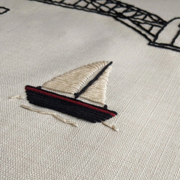 Bordado a mano en negro, rojo, marrón y crudo sobre lino crudo.